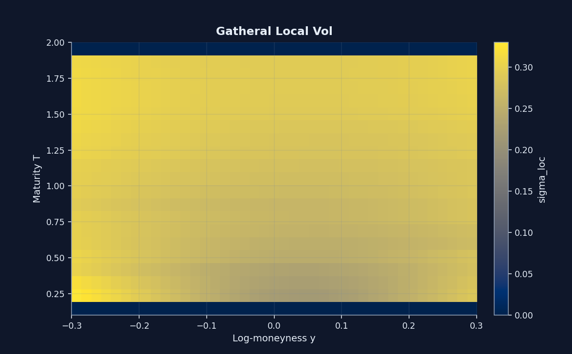 The hero carries the quant argument. One quieter downstream diagnostic remains only to show that, once the handoff is accepted, the resulting local-vol field becomes inspectable instead of breaking immediately at maturity seams.