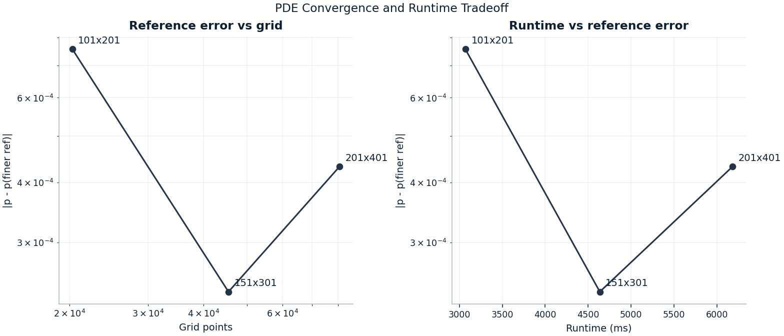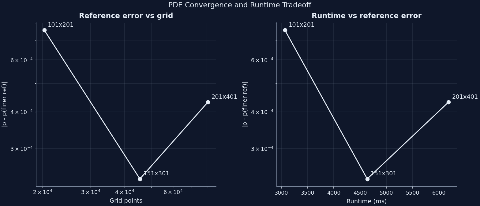 | Mesh check | single-option convergence/runtime sweep against a finer-grid PDE reference | Make the grid choice a defended tradeoff rather than a hard-coded habit |