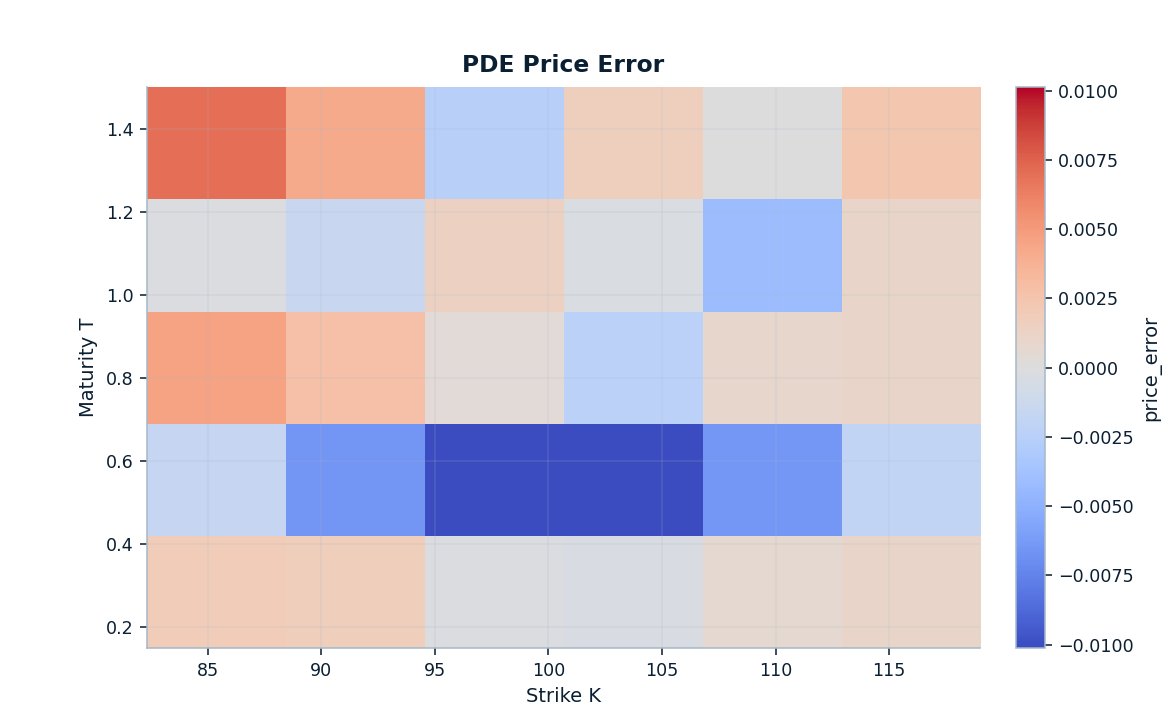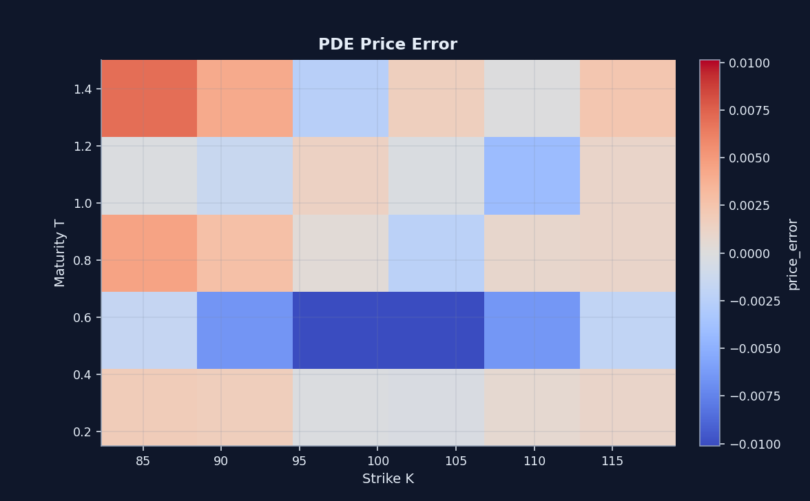 | Error localization | repricing scatter plus strike/maturity heatmap | Let reviewers see structure instead of trusting one mean |